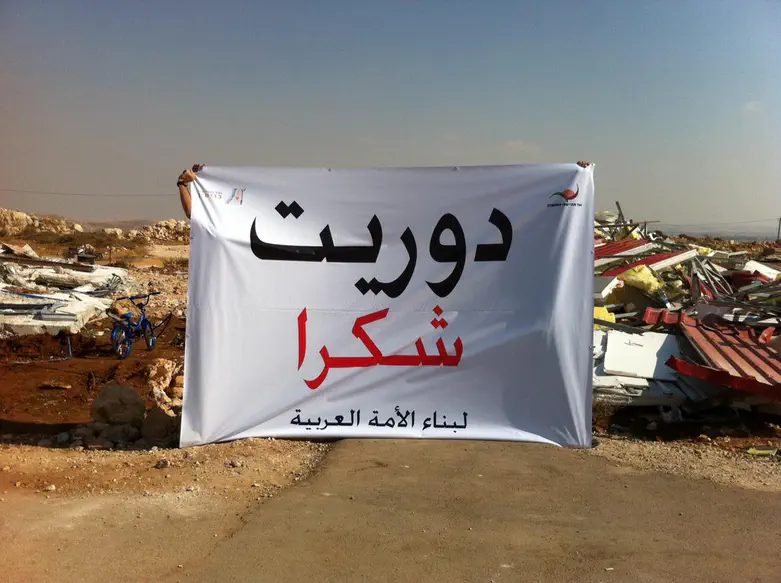השלט הראשון נשא את הכיתוב: "משפחה נזרקה לרחוב- בנימין נתניהו ראש ממשלת היהודים". על השלט השני נכתב בערבית: "דורית, תודה. למען בניין האומה הערבית".