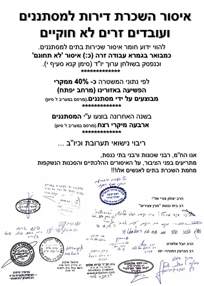 25 רבנים משכונות דרום העיר תל אביב חתמו על קריאה לתושבי השכונות ובעלי הדירות שלא להשכיר את הדירות למסתננים ועובדים זרים לא חוקיים.
