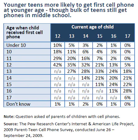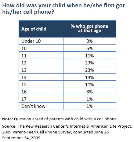 מחקר מעניין נערך בידי חברת Pew Internet & American Life Project – הם תשאלו הורים אודות גיל ילדיהם כאשר אלו קיבלו את הסלולרי הראשון בחייהם. הממצאים הם שלמחצית מילדי אמריקה נרכשים טלפונים סלולריים כבר בגיל 12-13. יתרה מכן, צויין כי הילדים המודרניים מקבלים את הטלפונים הרבה יותר מוקדם מאשר 5-6 שנים לפני.