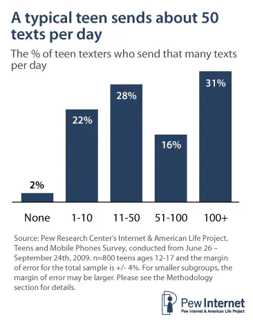 שליש מן המתבגרות שולחות יותר מ-100 מסרונים ביום או יותר מ-3000 מסרונים בחודש. ככל שהבנים יותר צעירים, כך קטנה מגמת כתיבת המסרונים – עד לרמה של 20 מסרונים ביום בגילאים 10-14.