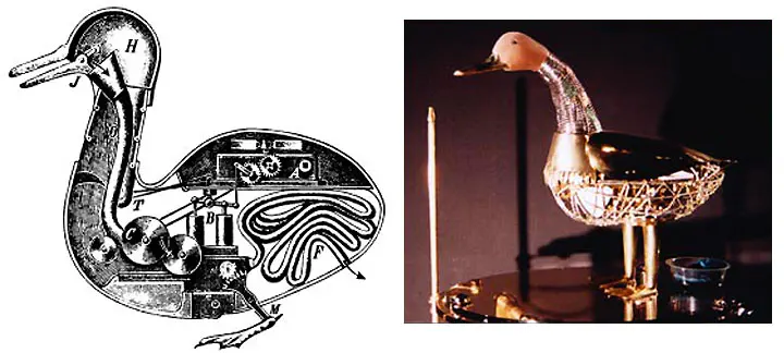 ככל שאומנות עשיית השעונים התקדמה אל מאת הנאורות של המאה השמונה עשר, התקדמה גם אומנות יצירת דמויות מכאניות וחיות. ג'אק וואקאסון, אמן החצר של מלכות צרפת היה ידוע במספר רב של יצירות נעות. אחת הדוגמאות המובהקות לאותה התקופה הוא נגן החלילית שממש בפועל ניגן בכלי הנגינה עוד בשנת 1738 והברווז המכאני מ-1739. הציפור מכוסה הנחושת יכלה לשבת, לעמוד, להתפלש במים לגעגע ואף להותיר רושם כאילו היא אוכלת מכף היד.