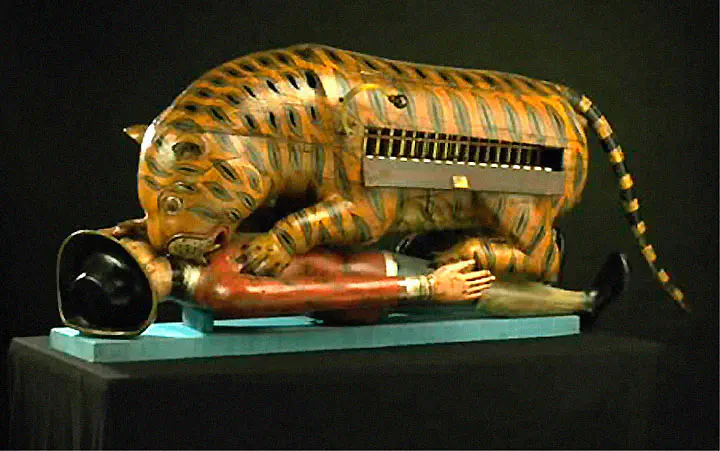 קוריוז מכאני נוסף ניתן במתנה בשנת 1790 לטיפו סולטן, מנהיג מייסור, שהיה מתנגד נלהב למשטר הקולוניאליסטי הבריטי. המכונה עשוית העץ הראתה נמר שתוקף חייל אירופי שהסתירה תיבת נגינה שהשמיעה נהימות.