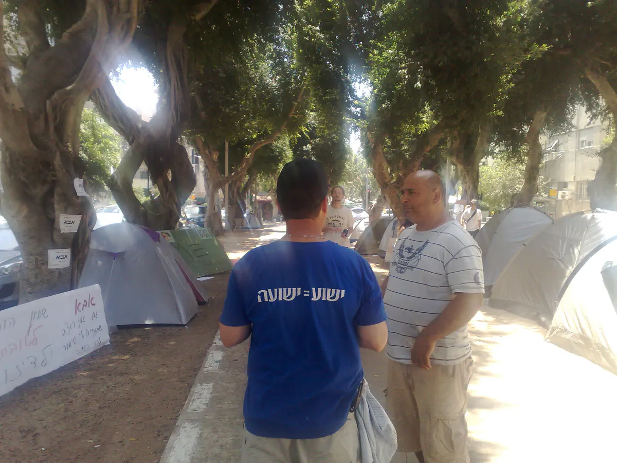 ערוץ 7 פגש שני פעילים מארגון המטיף לאמונה ב'אותו האיש' ובאמונות הנצרות. הפעילים הגיעו למאהל המחאה בשדרות רוטשילד ושוחחו עם העוברים ושבים בניסיון לשכנעם להאמין בישו. השניים סירבו להתראיין.