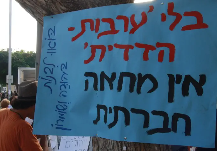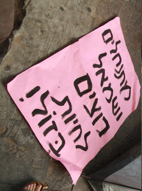 בתגובה צירפו אנשי הימין שלטים משלהם: "מתנחלים ושמאל רוצים לחיות בזול" "בלי ערבות הדדית אין מחאה חברתית".