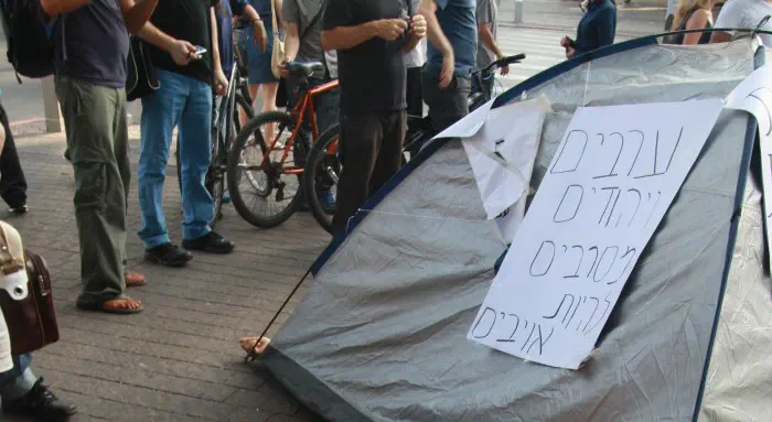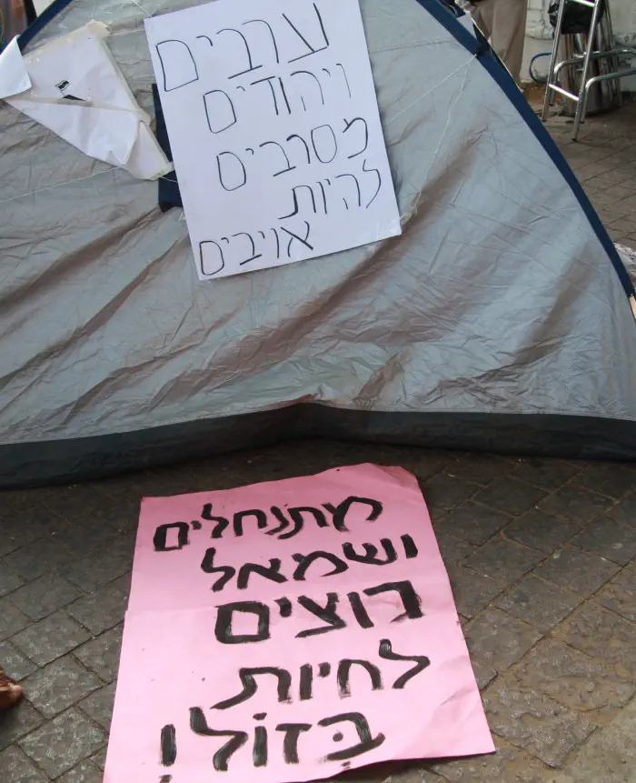 פעילי שמאל קיצוני הקימו היום (ראשון) מיצג מחאה ברחוב רוטשילד, סמוך מאוד למאהל הימין, הכולל אוהל ומתחתיו שוכבים אנשים, ותלויות הסיסמאות "יהודים וערבים מסרבים להיות אוייבים", "זו האלטרנטיבה ביהודה ושומרון", "לא בונים בתים על אנשים".