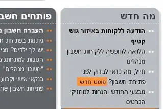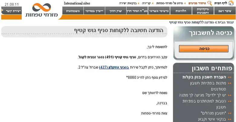 לקוחות בנק מזרחי טפחות הבחינו בדף הבית של הבנק מצד ימין "הודעה חשובה ללקוחות באזור גוש קטיף" באותיות קידוש לבנה.