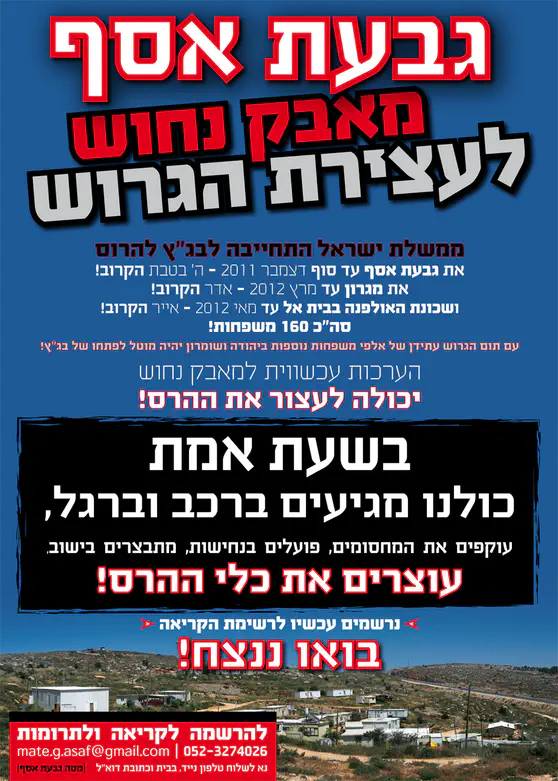 בתוך כך נציין כי הישוב גבעת אסף נערך למאבק משמעותי לעצירת הגרוש. בראשית השבוע פתחו בישוב בקמפיין לגיוס הציבור למאבק תחת הכותרת 'מאבק נחוש לעצירת הגרוש - בואו ננצח!'. במודעות הקמפיין קוראים תושבי הישוב לכלל הציבור 'להגיע בשעת אמת לעקוף את המחסומים, לפעול בנחישות, להתבצר בישוב ולעצור את כל ההרס'
