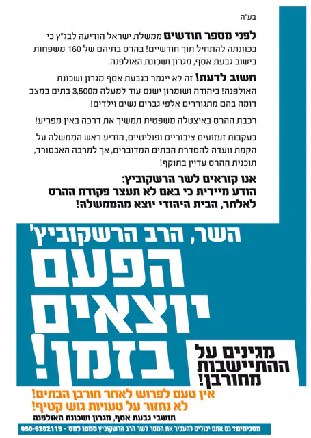 "אנחנו דורשים מהשר הרשקוביץ' להגיד בצורה נחרצת שאם ח"ו הממשלה תחליט על הריסת היישובים, אז סיעת 'בית היהודי' תהיה מחוץ לקואלציה", הדגיש שורק.