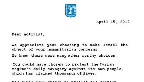 "פעיל יקר, אנו מעריכים את בחירתך בישראל כמושא דאגותיך בתחום זכויות האדם. אנו יודעים שעמדו בפניך אפשרויות ראויות רבות. היית יכול לבחור למחות נגד הטבח היומי שמבצע המשטר הסורי בבני עמו, שגבה אלפי קורבנות. היית יכול לבחור להפגין נגד הדיכוי האלים שמפעיל המשטר באירן נגד מתנגדיו וביצוע פיגועי טרור ברחבי העולם".