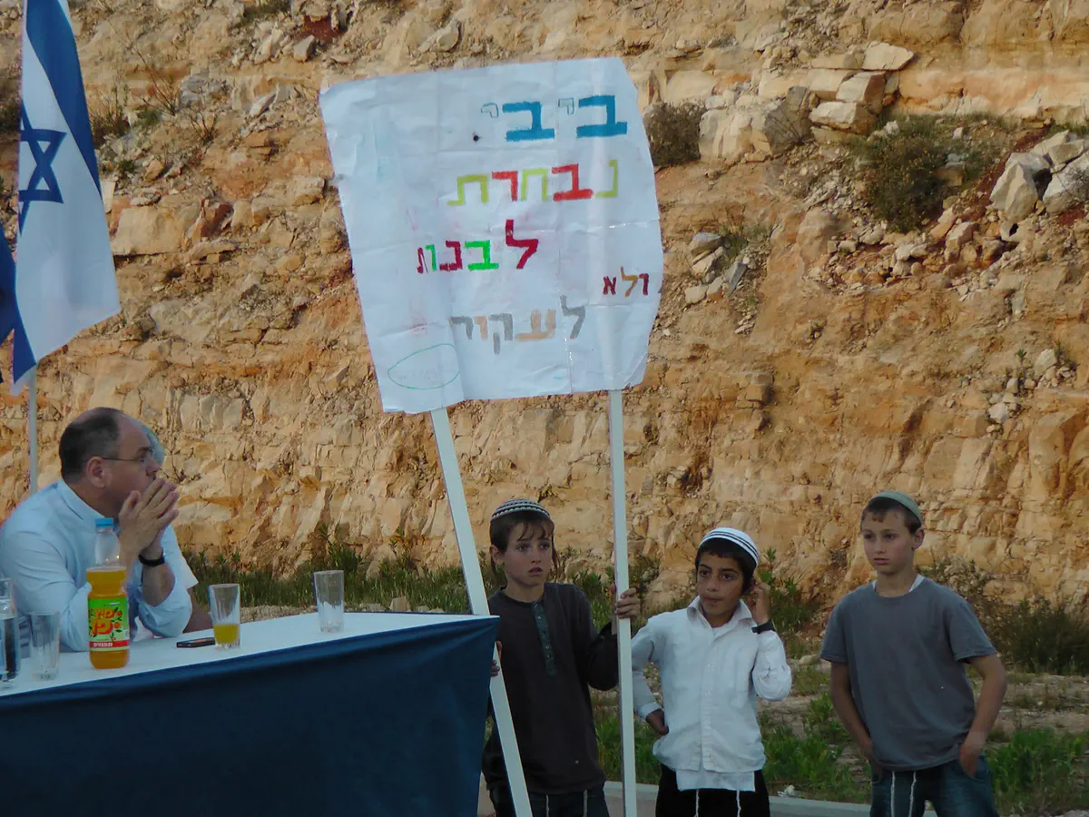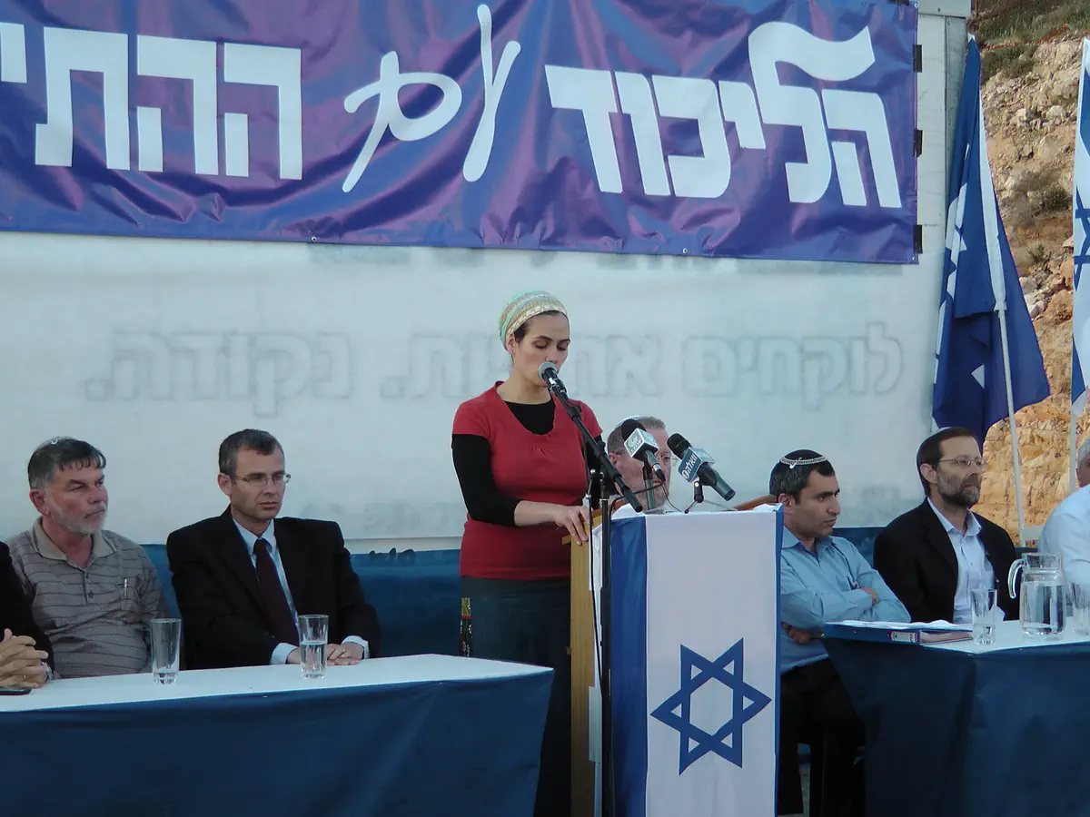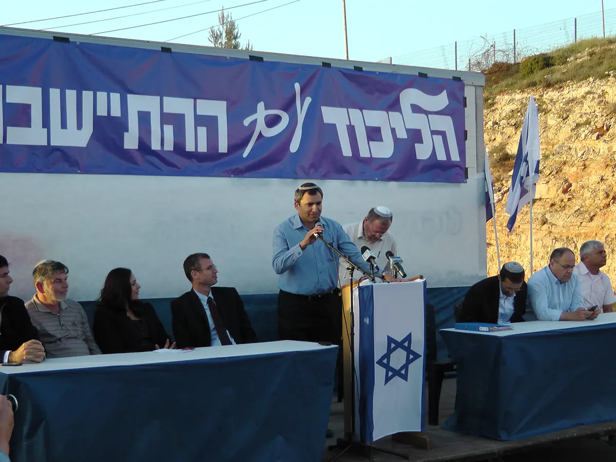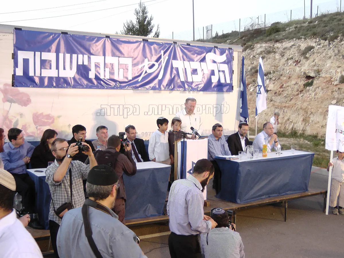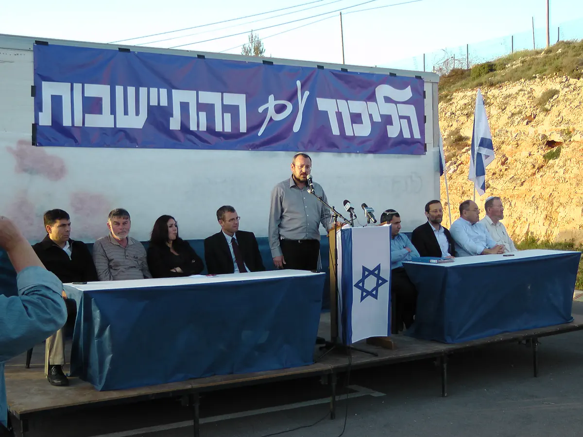כנס של חברי מרכז ליכוד התקיים הערב (ראשון) בשכונת האולפנה בבית אל, אשר חרב ההרס מתנוססת מעל ראשה.