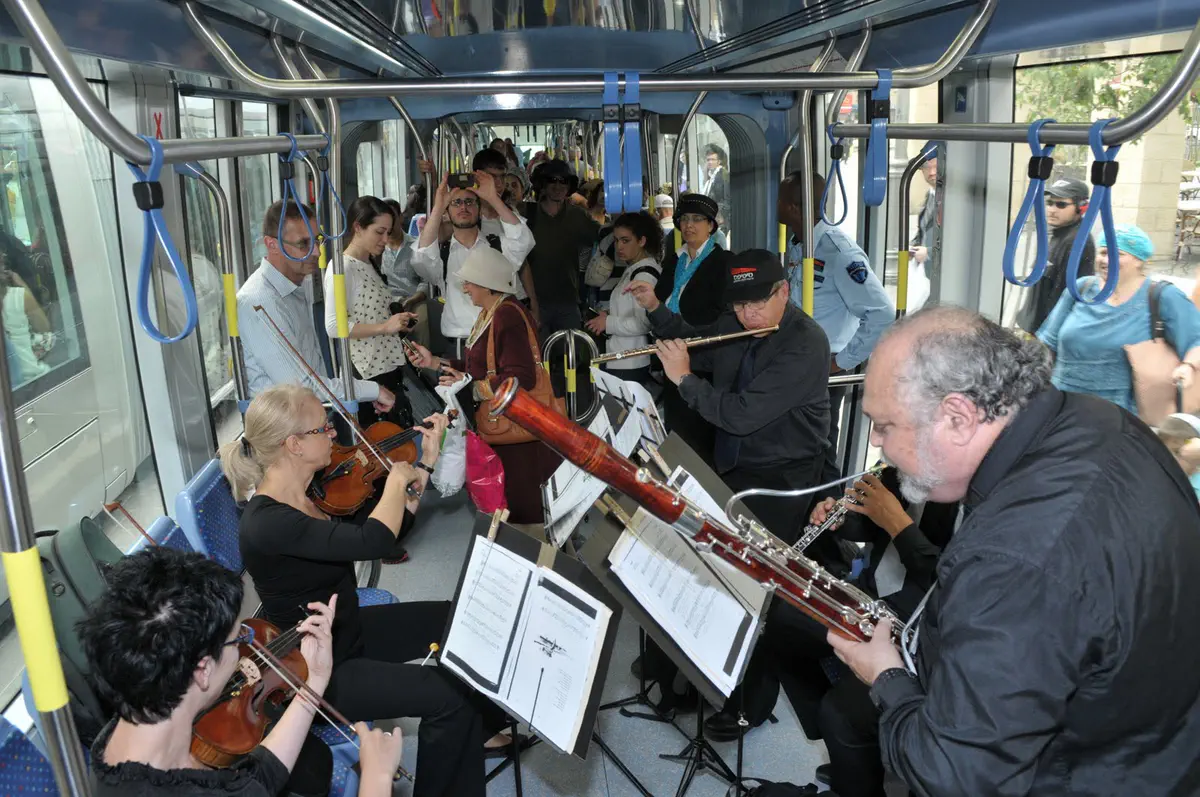 8 נגנים מהתזמורת הסימפונית ירושלים ניגנו לנוסעים בקרונות הרכבת מחרוזת של שירי ירושלים ומוסיקה קלאסית. בקרב הנוסעים הורגשו הפתעה ושמחה מהרעיון ורבים בחרו להצטרף בשירה ובמחיאות כפים.