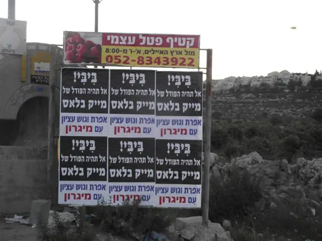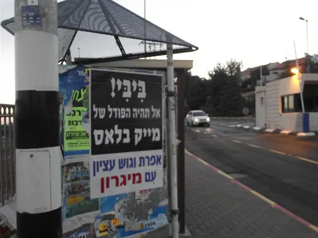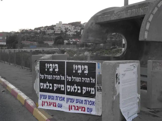 במהלך הלילה תלו פעילי 'נשים בירוק' לאורך ציר התנועה המוביל מירושלים לאפרת כרזות ועליהן הכיתוב "ביבי! אל תהיה הפודל של מייק בלאס! אפרת וגוש עציון עם מיגרון".