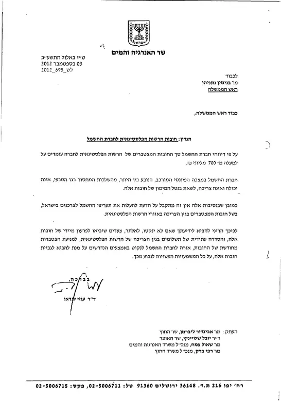 "על פי דיווחי חברת החשמל, סך החובות המצטברים של הרשות הפלסטינאית לחברה, עומדים על למעלה מ-700 מליוני ש"ח", פתח לנדאו את מכתבו לראש הממשלה. לנדאו הדגיש כי חברת חשמל במצבה הפיננסי המורכב, הנובע בין היתר מהשלכות המחסור בגז טבעי, אינה יכולה ואינה צריכה, לשאת בנטל המימון של חובות אלו.