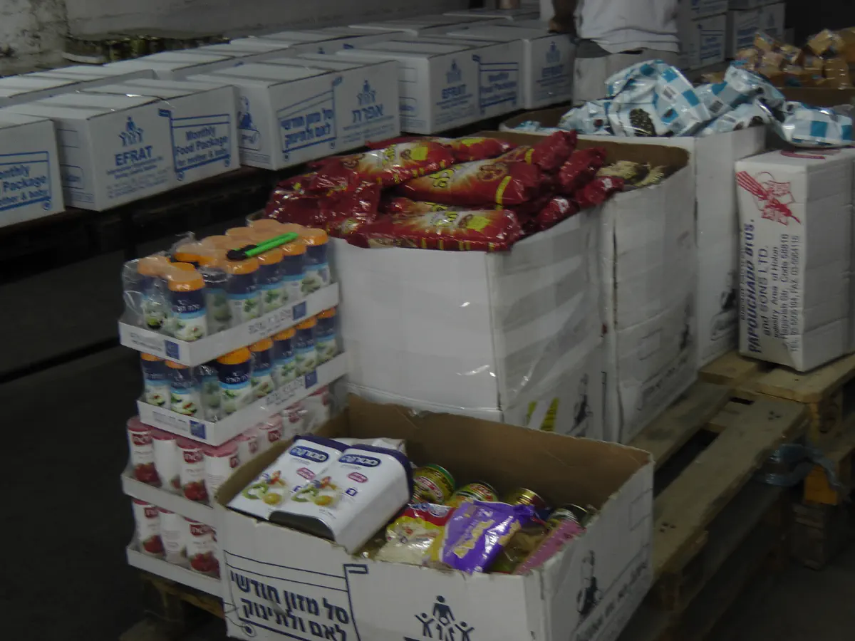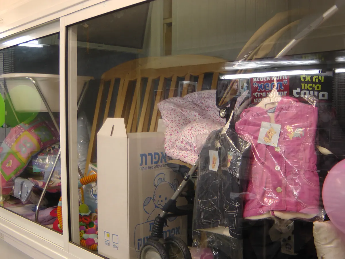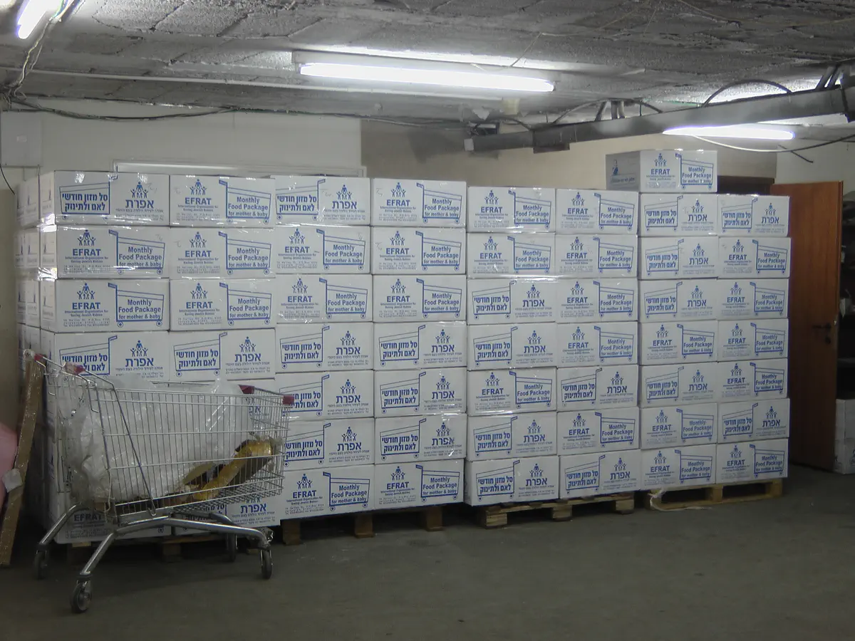 בסוף הכתבה אני יורד עם ד"ר שוסהיים למחסן כדי לראות את הסיוע הכלכלי מקרוב. המחזה מדהים אלפי אריזות של חיתולים, מטרנות, בקבוקים, מיטות תינוק, עגלות, מצרכי מזון.