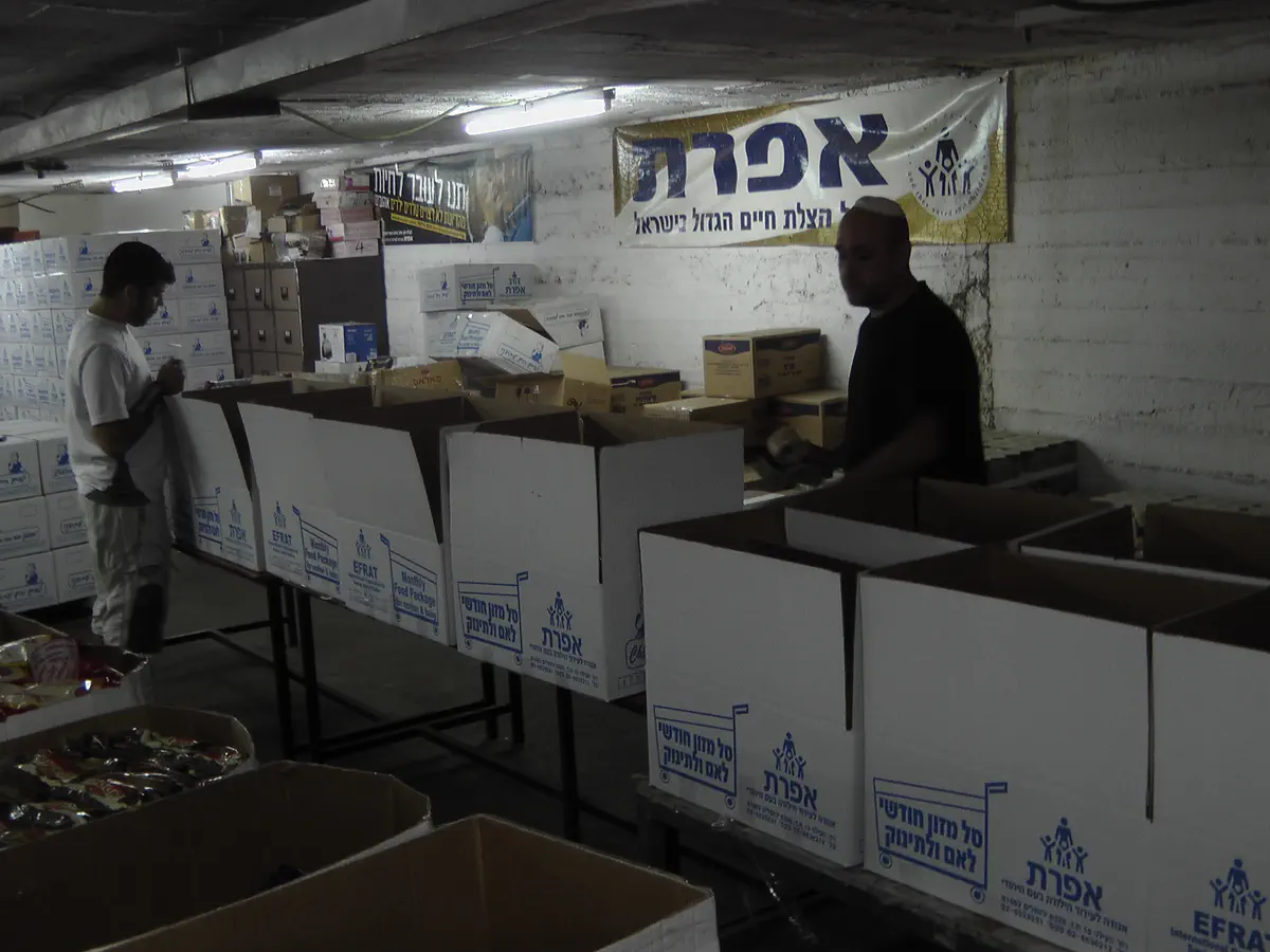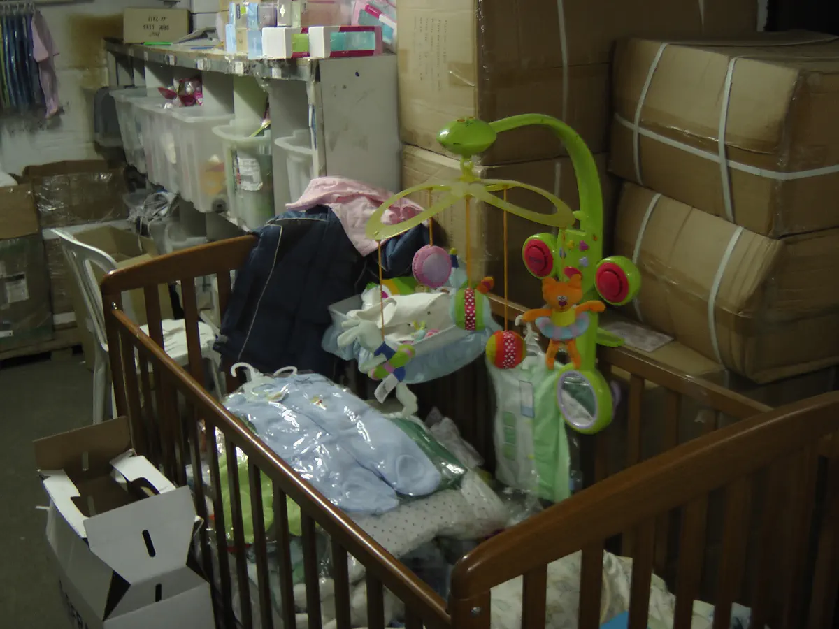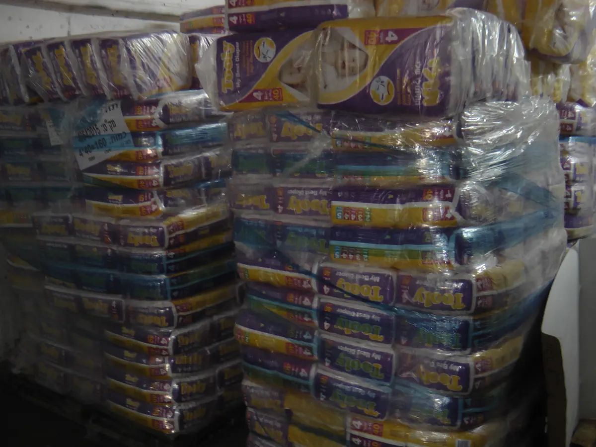 בסוף הכתבה אני יורד עם ד"ר שוסהיים למחסן כדי לראות את הסיוע הכלכלי מקרוב. המחזה מדהים אלפי אריזות של חיתולים, מטרנות, בקבוקים, מיטות תינוק, עגלות, מצרכי מזון.
