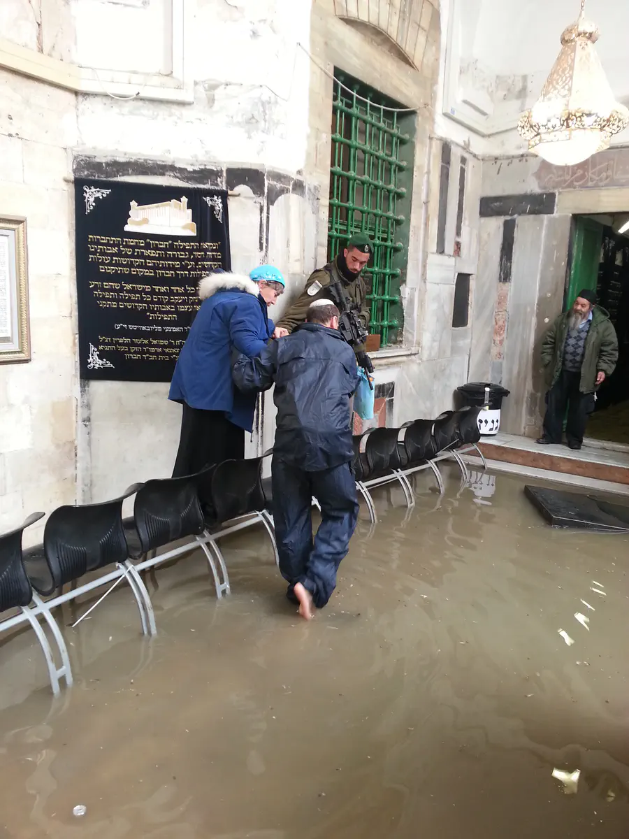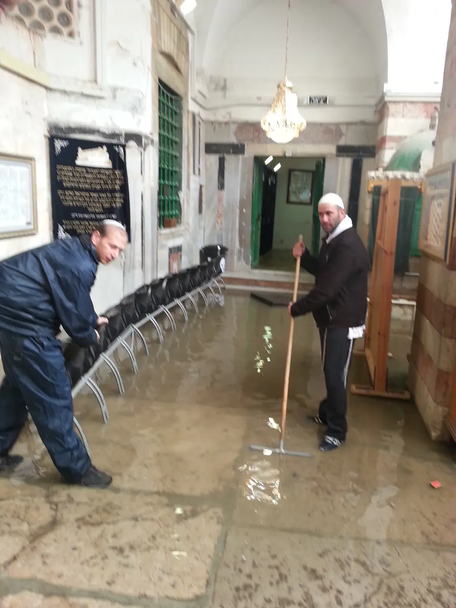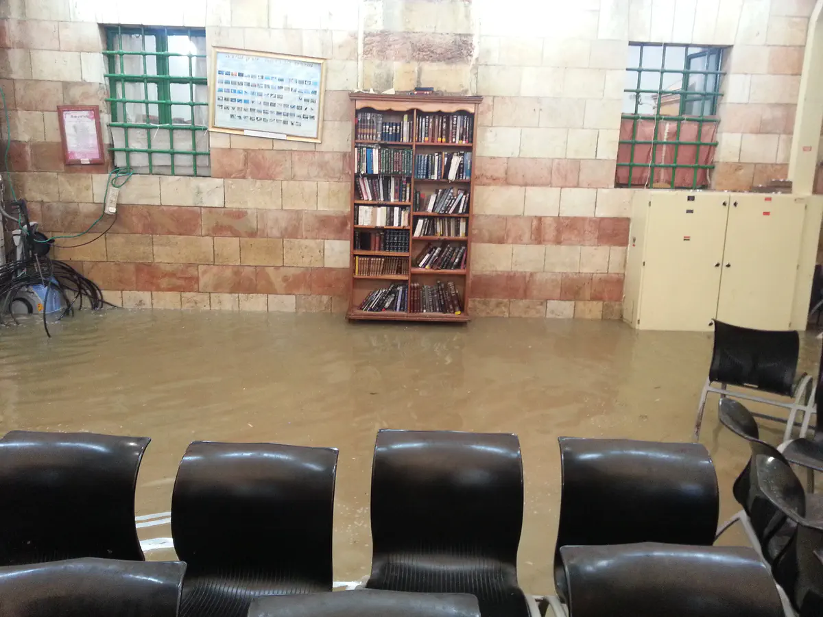 אולם התפילה במערת המכפלה שבחברון הוצף היום (שני) בעקבות גשמי הברכה.
