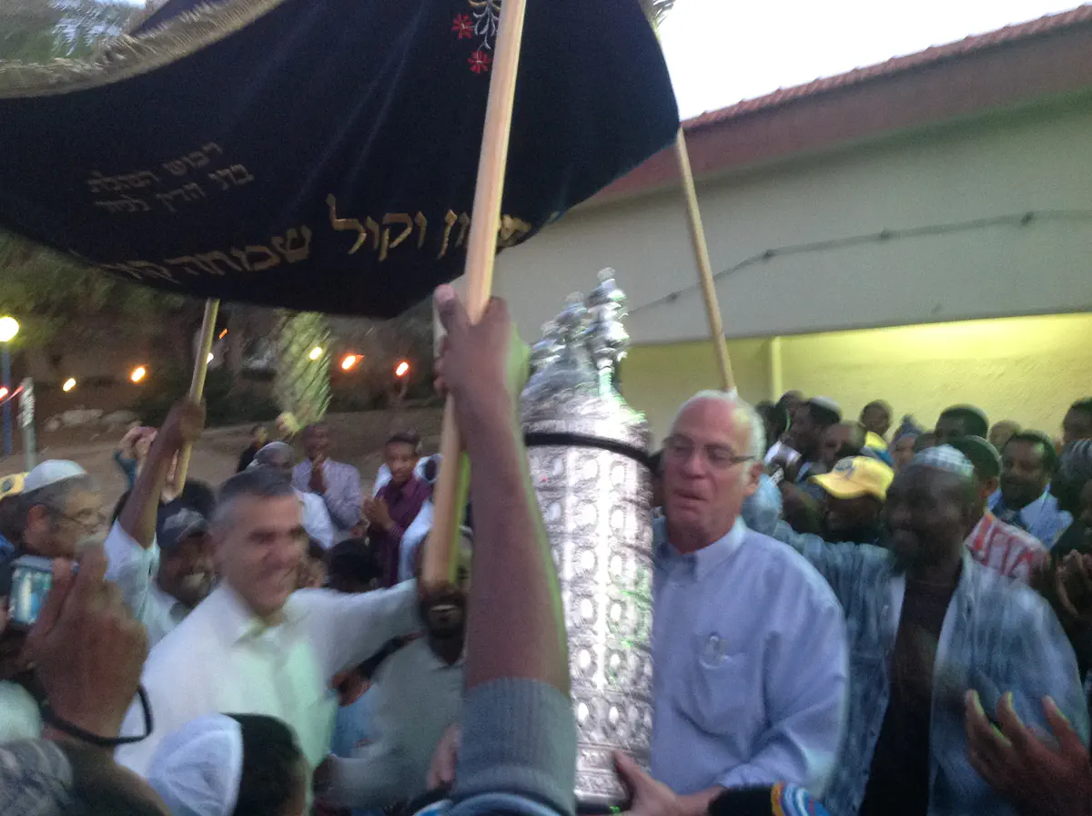 ספר התורה שנתרם על-ידי משפחת זלוף צ׳ארלס ואריאלה הוכנס בשירה וריקודים מסורתיים לבית הכנסת במרכז הקליטה.