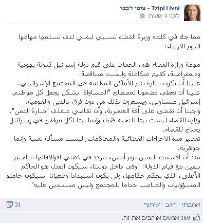 שרת המשפטים החדשה, ציפי לבני, פירסמה היום (שלישי) סטטוס בפייסבוק, בו הסבירה בשפה הערבית את יעדיה במשרד המשפטים.
