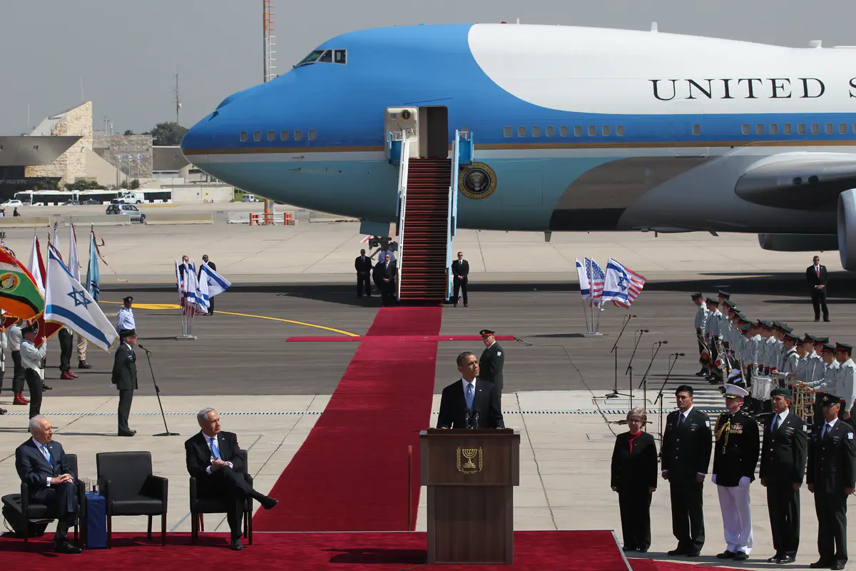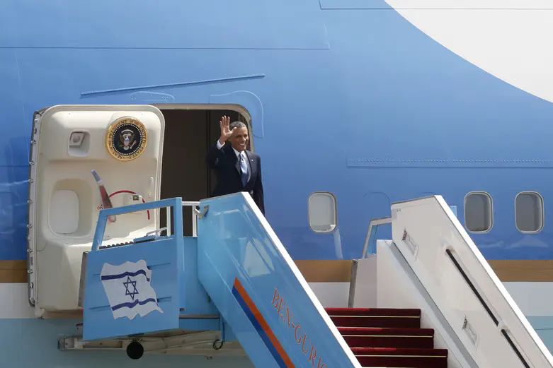בחיוך רחב יצא אובמה מדלת המטוס המלכותי אייר פורס 1, שנפתחה בשעה 12:07 בדיוק, ונופף למקבלי הפנים שהמתינו לו על השטיח האדום.