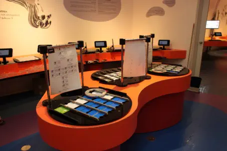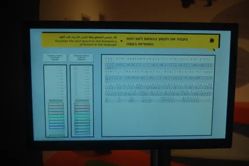 יהונתן חן ומשה מונק תכננו את המוצג המופיע בתמונה העוסק בפיצוח צופן החלפה פשוט – צופן בו כל אחת מאותיות הא"ב מוחלפת באות אחרת. הפיצוח אינו מסובך הודות לעובדה שלכל אות בשפה, יש תדירות אופיינית.