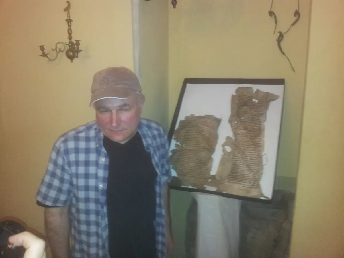 מירוסלב משחזר במהלך היום את דפי ספרי התורה הקרועים ומנסה לחבר ביניהם.