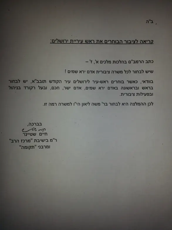 במכתב תמיכה ששלח קרא הרב שטיינר באופן חד משמעי לתושבי ירושלים להצביע עבור משה ליאון.