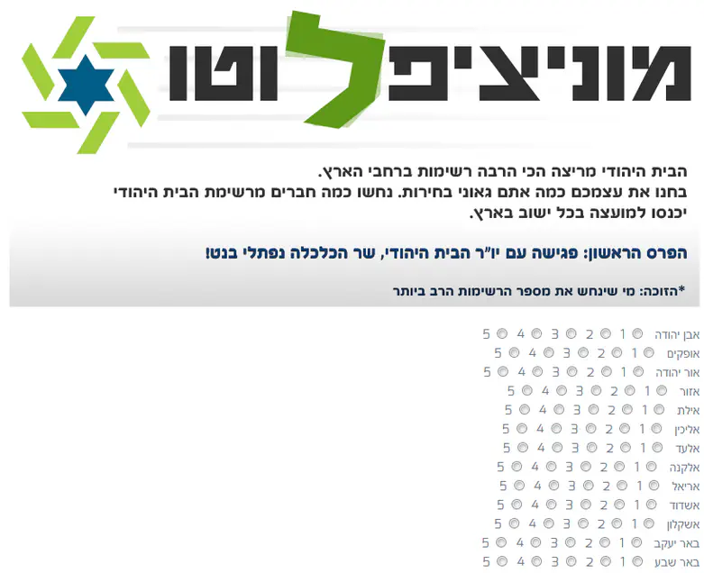 המטה השיק משחק הימורים, "מוניציפלוטו", דמוי לוטו, בו מתבקשים הגולשים לנחש כמה מנדטים תקבל כל אחת מרשימות 'הבית היהודי' ברחבי הארץ.