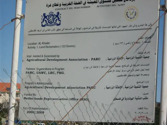 השלט מטעם ממשלת הולנד, העומד בכניסה לנצר, מעיד יותר מאלף מילים על כוונותיהם שהם : " עזרה כספית וחקלאית לערבים בגאולת קרקעות - 123 דונם". רשומים על השלט ארבע ארגונים ומשרד ההסברה של הולנד- כולם שותפים בדאגתם "הכנה" לערבים".