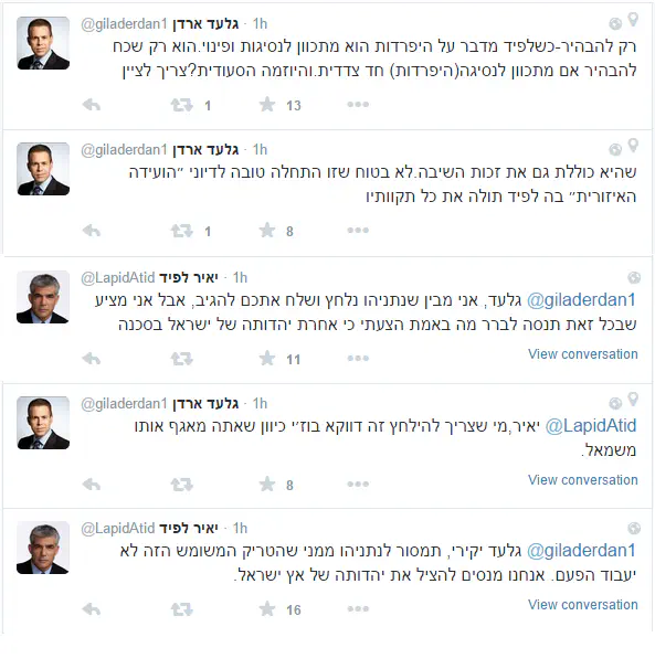קרב ציוצים בין השר לביטחון פנים גלעד ארדן (הליכוד) ליו"ר מפלגת "יש עתיד", יאיר לפיד, שהציג היום (ראשון) את תכניתו המדינית - ועידה אזורית עם מדינות ערב המבוססת על תכנית השלום הסעודית.