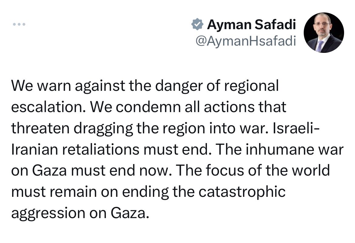 שר החוץ הירדני איימן א-ספדי התייחס לפרסום לפיו ישראל תקפה באיראן, "אנחנו מזהירים מפני סכנה של הסלמה אזורית. אנחנו גם מגנים את כל הפעולות שמאיימות בגרירת האזור למלחמה. פעולות התגמול הישראליות-איראניות חייבות להסתיים", אמר.