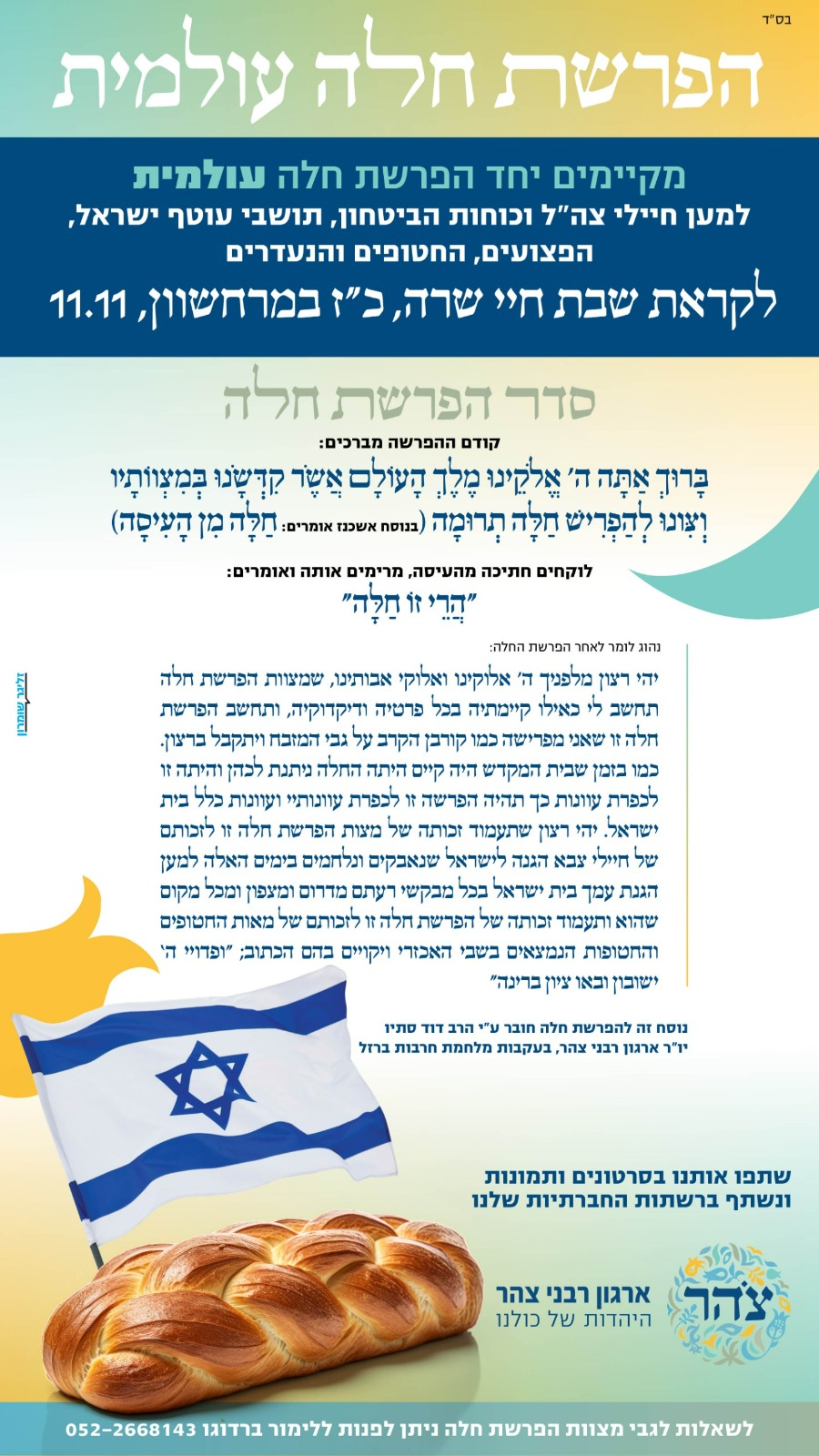 לקראת השבת הקרובה תתקיים הפרשת חלה עולמית שמוביל ארגון רבני צהר למען חיילי צה"ל וכוחות הביטחון, למען תושבי עוטף ישראל למען הפצועים, ולמען החטופים והנעדרים.