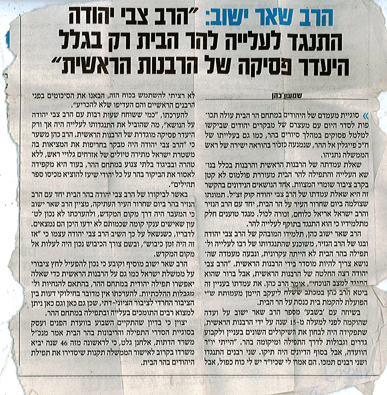 ישיבתו לא עולה. הרב יהושע מתנגד לעלייה ואף כתב מאמר למורא מקדש.