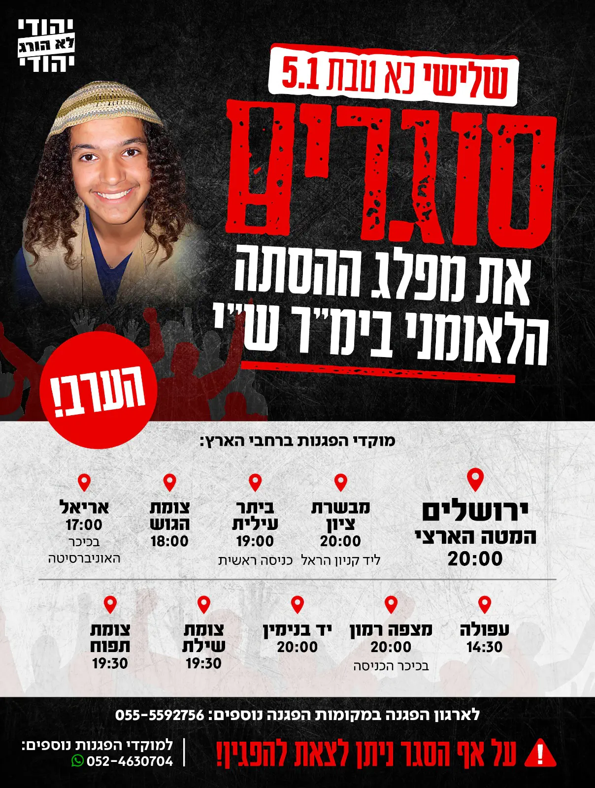 מחר בערב בעז"ה תתקיים הפגנה מרכזית בירושלים בגשר המיתרים, גם מי שלא תמיד מגיע להשתדל מחר לבוא כדי שתהיה הפגנה גדולה ורצינית ויהיה הרבה רעש תקשורתי. אין בעיה של סגר כי מותר לצאת לצורך הפגנה