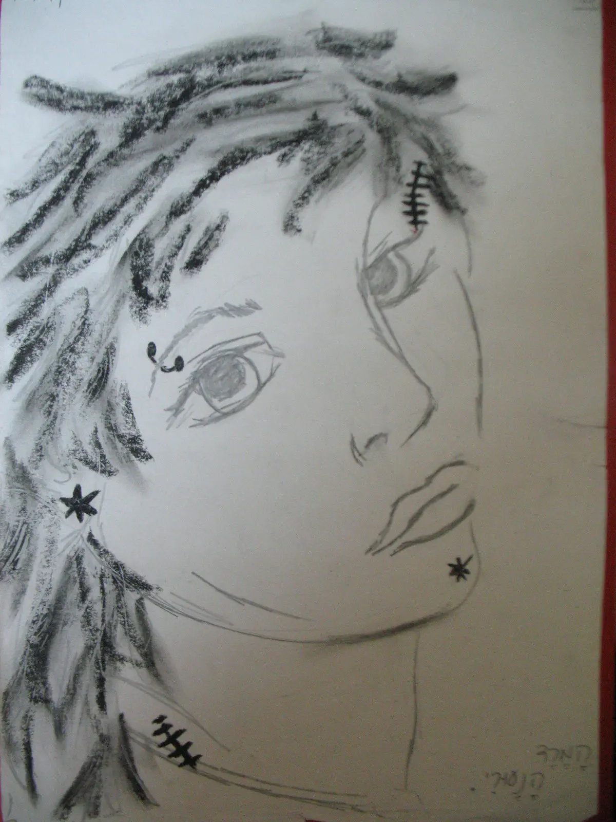 פרצוף מדויק ואמיתי, עיניים יפות. אף נראה אמיתי. צבעי הפנדה/גיר שחור לשיער מוסיף מאוד. יישר כח!