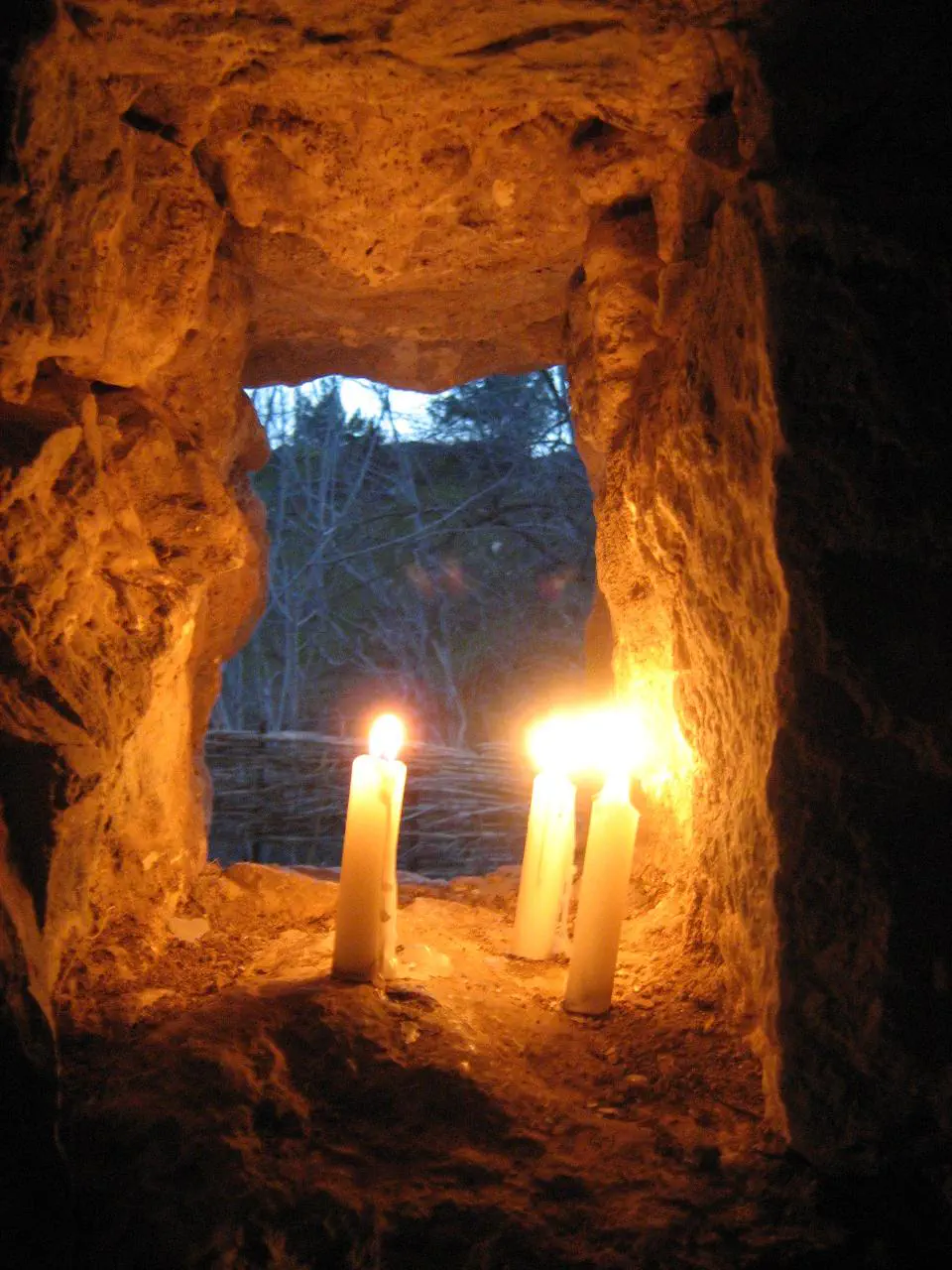 מעניין הניגודיות בן האור והחוך של הנרות לבין הרקע שמאחורה.