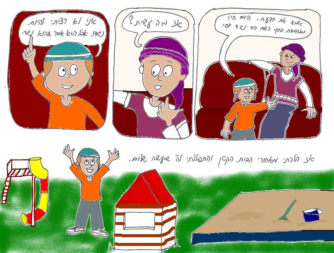 ואת המתקן בצד ניסיתי לחפש בבית ציור של גן ילדים ומצאתי בספר 'הסנדל של איל' אבל ההעתקה לא יצאה משהו.. (שימו לב שכדי להכנס להתגלש צריך איכשהו לקפוץ מלמעלה.. זה מתקן לאלופים :) )