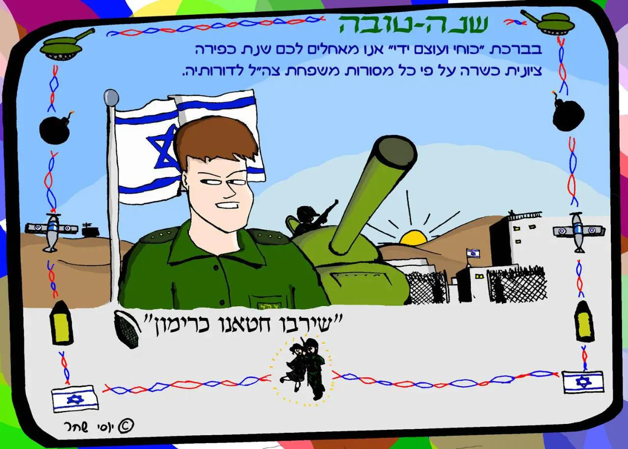 כתוב מעל לציור שזה ציור ציני של, כאילו, ברכת שנה טוסבה מסאטמר לצה"ל. ולצייר אין שום קשר למסר. מה עוד לכתוב? אולי אתה רוצה גם לראות את התעודת לוחם שלי? להוכיח לך שישנתי בשוחות במשך שבועיים בעזה במבצע עופרת יצוקה? אני צריך להוכיח שאני ציוני? אולי גם אני בכלל גוי, אה??? מה עוד אני צריך לעשות כדי שיפסיקו לחשוב שאני פרובקטור של המחלקה החרדית בשב"כ????