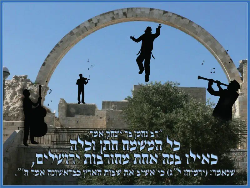 הייתי שמה פונט אחר, טיפה יותר פשוט משו בסגנון של gutman aram. האנשים ממש יפים! הייתי מקטינה את המקפצץ ואז הוא היה נראה יותר רחוק (הוא נראה קצת תלוש.) כנ"ל לגבי ההוא עם הכינור טיפונת להקטין ואז יכול להיות שהיה נראה קצת יותר טוב, למרות שהוא די טוב בקטע הזה :-) הציציות של המקפצץ נראות לי קצת לא אמינות. זהו להיום... סה"כ אני חושבת שעשית עבודה טובה ומאוד השקעת. גם הרעיון מאוד מקורי! נ.ב לגבי התמונה עצמה- הייתי שמה את הקשת של החורבה באמצע התמונה.