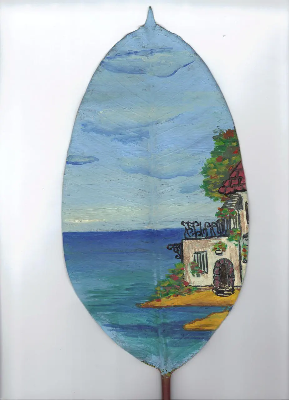 מיבשים את העלים בספר ישן וכבד ואחר כך מציירים עליו. זהו חומר אורגני כך שניתן לצייר עליו כמו בד בצבעי שמן או אקריליק. הציור פשוט יפיפה והעלה הופך אותו למסתורי ומענין (רוצים לדעת מה מסתתרבחלק שמעבר לעלה.
