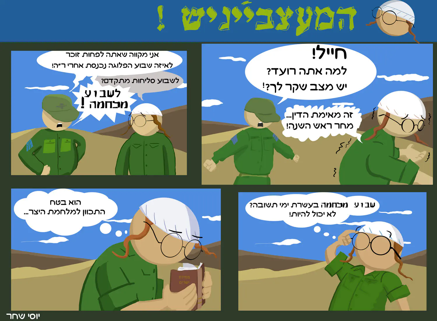 לא כל הביינישים כאלה. אבל אני גם לא חושב שכל הביינישים כאלה כבדים שהם יקחו את הקומיקס הזה ברצינות. אם אתה תיקח כל קומיקס בכזאת רצינות אז גם תעלב מהקומיקס "בבא" של שי צרקה שגיבור הקומיקס הוא די טמבל ולוזר והוא גם דתי. אז בוא נטען נגד שי צ'רקה שהוא מוציא את הדתיים טמבלים ולוזרים. הרי ברור שזאת לא כוונתו. הקומיקס שלי בודאי צוחק על דמות שהוא בייניש והבדיחות יכולות לקרות רק בגלל השילוב הזה של בייניש מול מפקד חילוני. אבל זה לא אומר שככה הביינישים. אני בעצמי בייניש וכל הבדיחות של הקומיקס הזה מבוססות על בדיחות שהיו אצלינו במחלקה. רק שאצלינו אמרנו את זה בצחוק וכאן אני מצייר את זה כאילו שככה הבייניש חושב ברצינות. קיצר, אל תיהיה כבד. חכה ותראה שביום שתתגיס ותיהיה בעצמך בייניש זה יצחיק גם אותך.