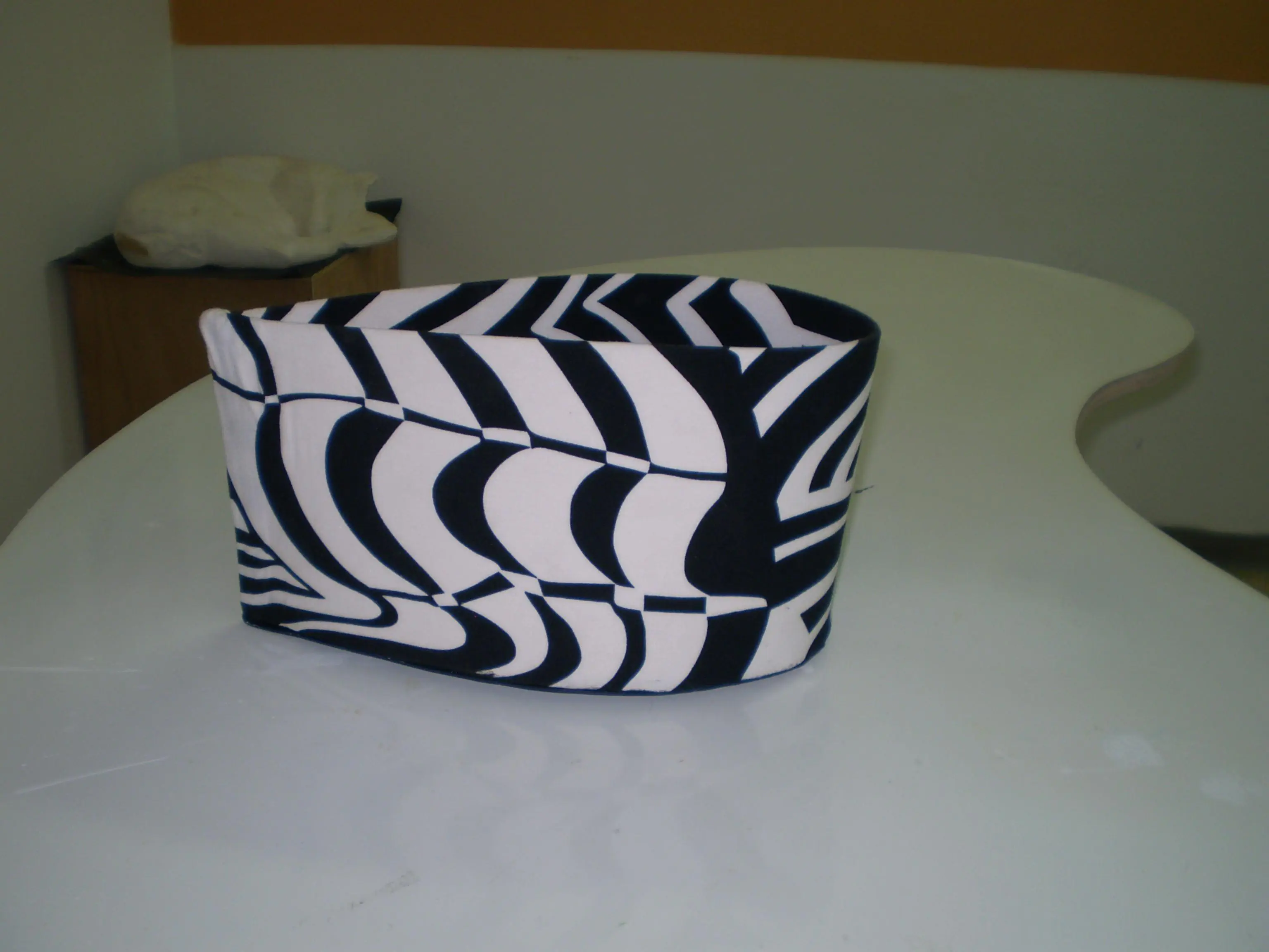 טכניקה: הקופסא עשויה מקרטון ביצוע, מודבקת בדבק חם ועטופה בבד. מתחת מודבק עוד קרטון ביצוע צבוע באקריליק שחור ובתוכה יש עוד דופן של קרטון ביצוע בצורת טיפה עטופה בבד.