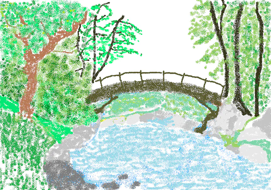 הארה- בקטע המרכזי והאמצעי של הציור- מעל הגשר- אין כלום. לבן. ריק. בציור המקורי יש שם הר עם שביל לבן... רצוי למלא שם כמו במקור- הר ושביל, או למלא בתכלת עדינה של שמיים.
