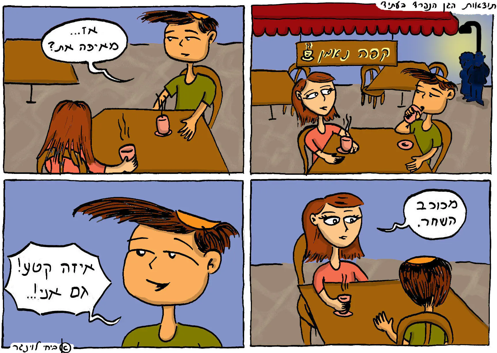 אם אתה רוצה ליצור קומיקס ,תפאדל,רק תדאג שיהיה תוכן ,מצחיק,עם פואנטה. סליחה על הכאסח,פשוט הבדיחה לא מתאימה. בקשר לציור,השער של הבחורה קצר או ארוך (איך פתאום הוא מחסה את הכתפיים?) תהיה עקבי. נוסף על כך,ברקן (או אביחי לוינגר) זו אמורה להיות קריקטורה? אם כן עדיף להוסיף תווי פנים מוגזמים מאשר אורך בלורית מוגזם,זה נותן לדמויות קצת אופי.