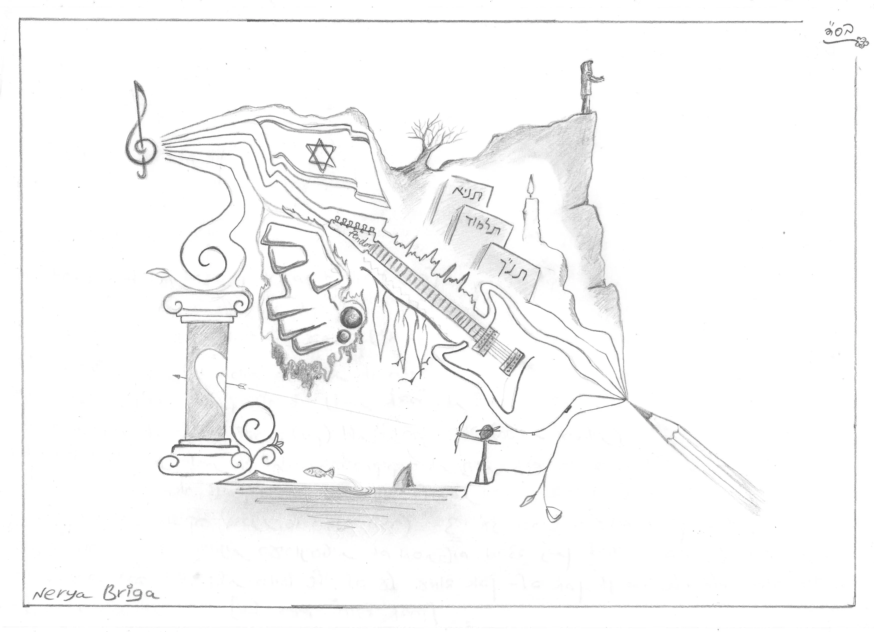 שבעת הקווים היוצאים מן העיפרון ושבעת התווים היוצאים ממפתח הסול מרכיבים ציור שלם. שניהם מתארים אומנות, שזה תחום שאני אוהב ורוצה לעסוק בו. המתפלל נמצא במקום הכי גבוה- "אין בונים בית הכנסת אלא בגבהה של עיר ומגביהין אותו עד שיהיה גבוה מכל בתי העיר" (שו"ע או"ח סימן קנ הלכות בית כנסת סעיף ב) . המתפלל נמצא מעל שלוש דרגות המכוונת כנגד שלושת אבות האומה- אברהם, יצחק ויעקב (וכנגד שלוש הספירות חסד,גבורה ותפארת) כי "תפילות אבות תיקנום". הנר- "נר ה' נשמת אדם". התנ"ך מסמל את התורה שבכתב, הגמרא- את תורת ה'נגלה' שבע"פ, וספר התניא- את תורת ה'נסתר' שבע"פ. דגל ישראל מתאר את חזון תחיית העם היהודי בארץ ישראל שב"ה מתגשם ומתממש מול עיננו. הקו שעל הגיטרה יכול להתפרש בשלושה מובנים (שלאו דוקא סותרים):