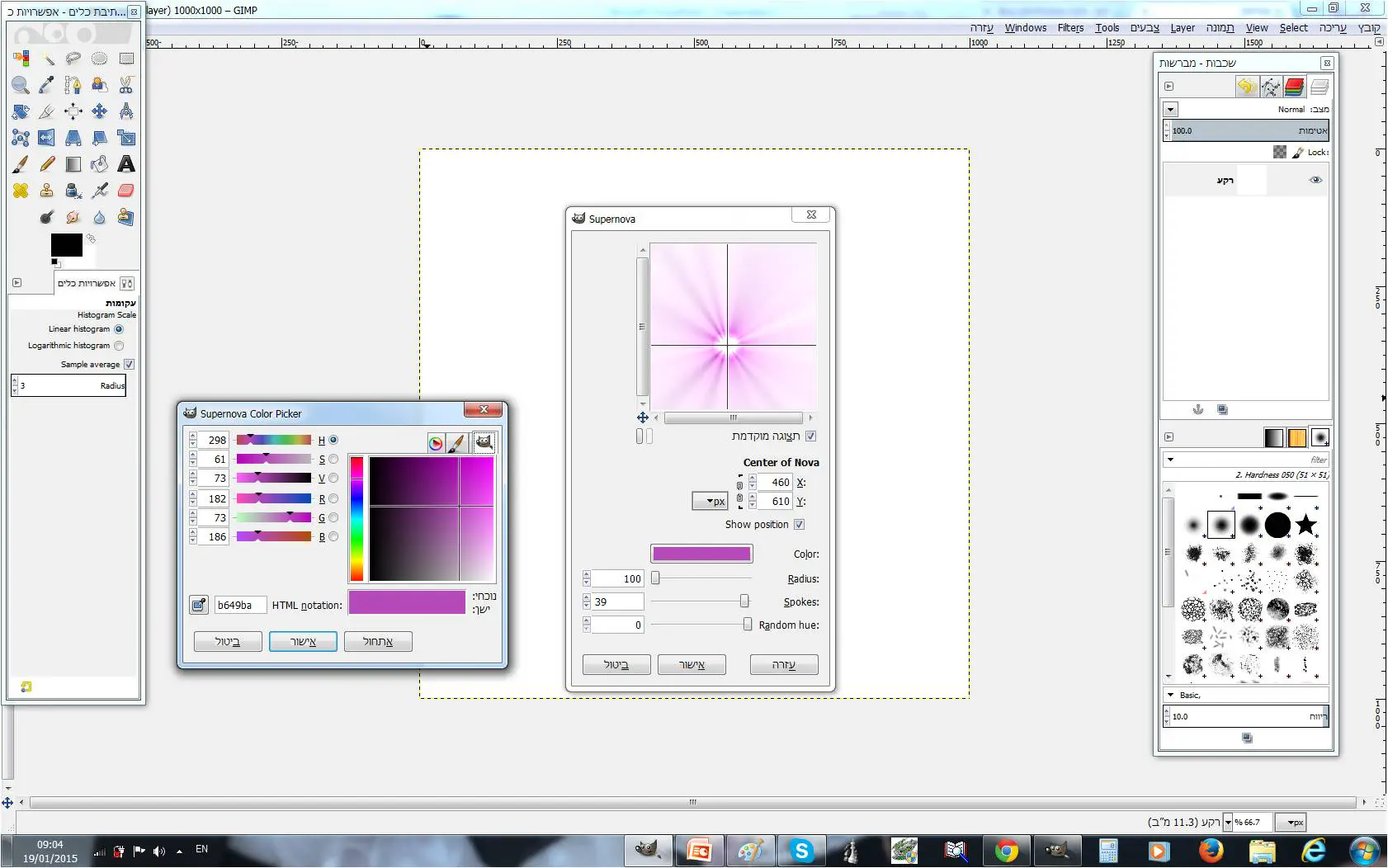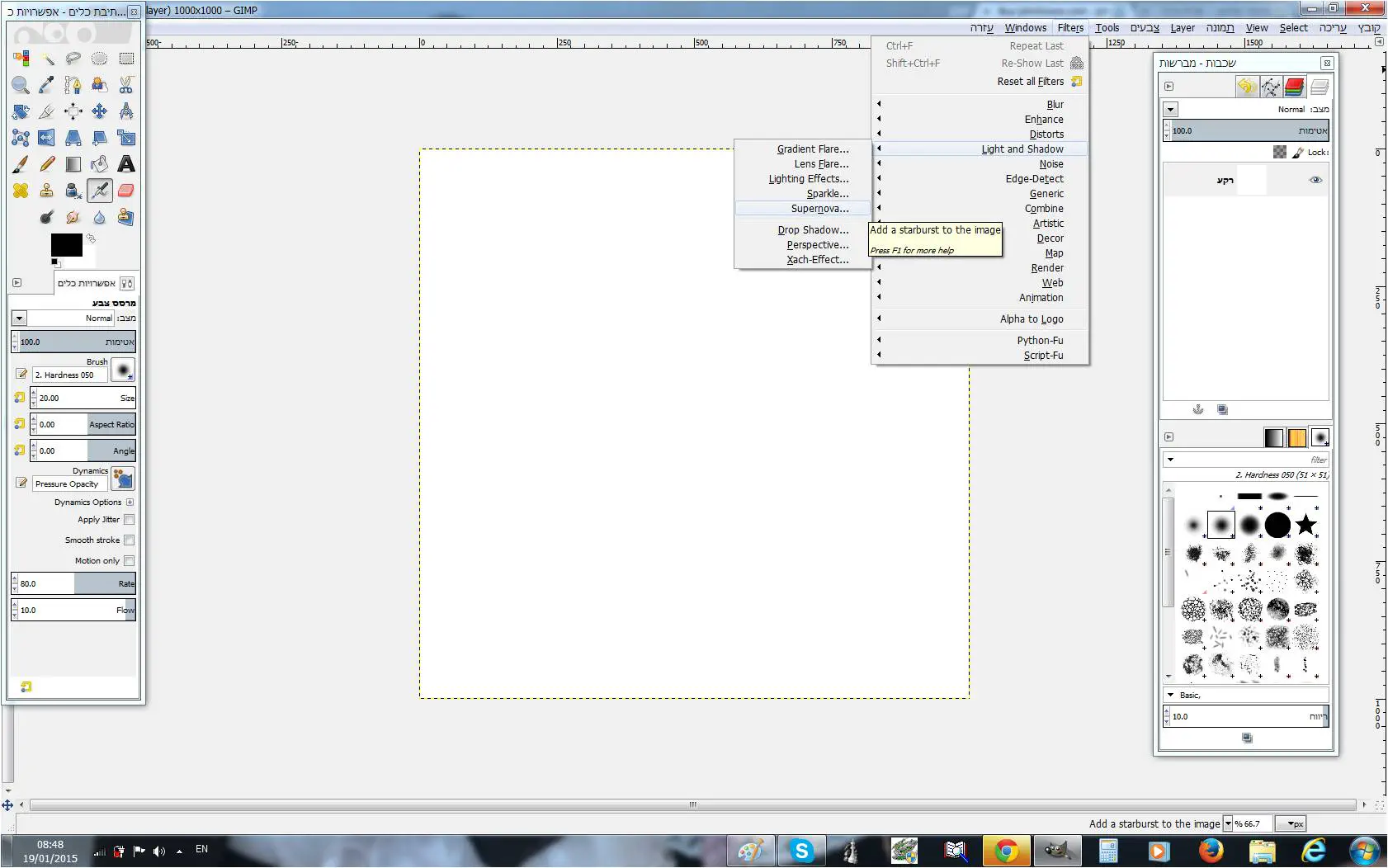 כדי ליצור פרחים כאלה בגימפ הולכים לשורת התפריט למעלה ובוחרים בפילטר( filter) ובאור( light ) ויוצרים אור שנקרא סופרנובה supernova .