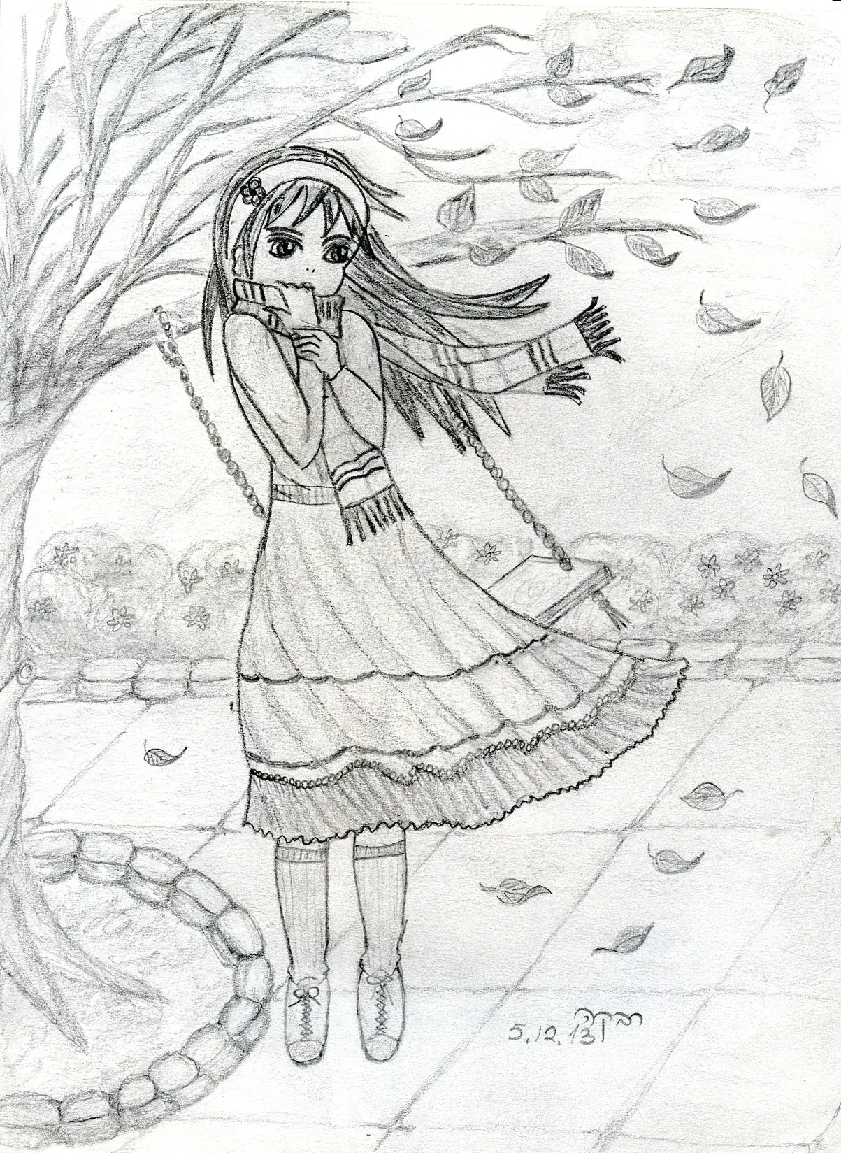 ובכל זאת איור מתוק. התנועה של הרוח מעיפה את השיער, הבגדים והעלים מצוירת מעולה. מה יש לה ביד? בהתחלה חשבתי שזה מפוחית... בהצלחה עם הלימודים!