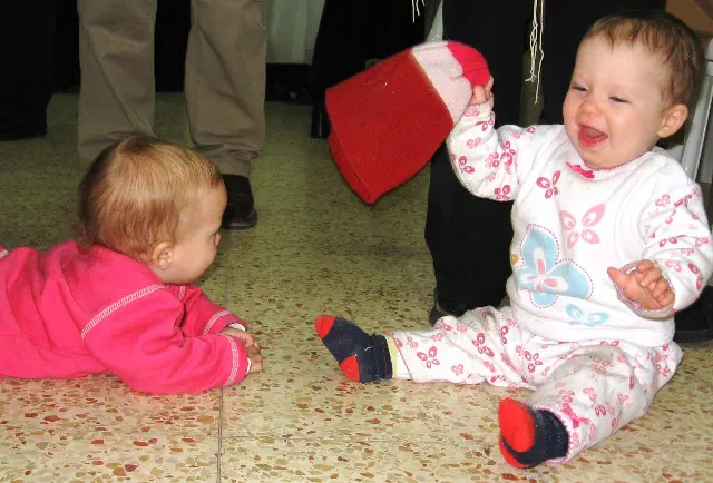 האחות חוטפת לאחותה (התאומה) את הכובע וזה עוד מצחיק אותה..