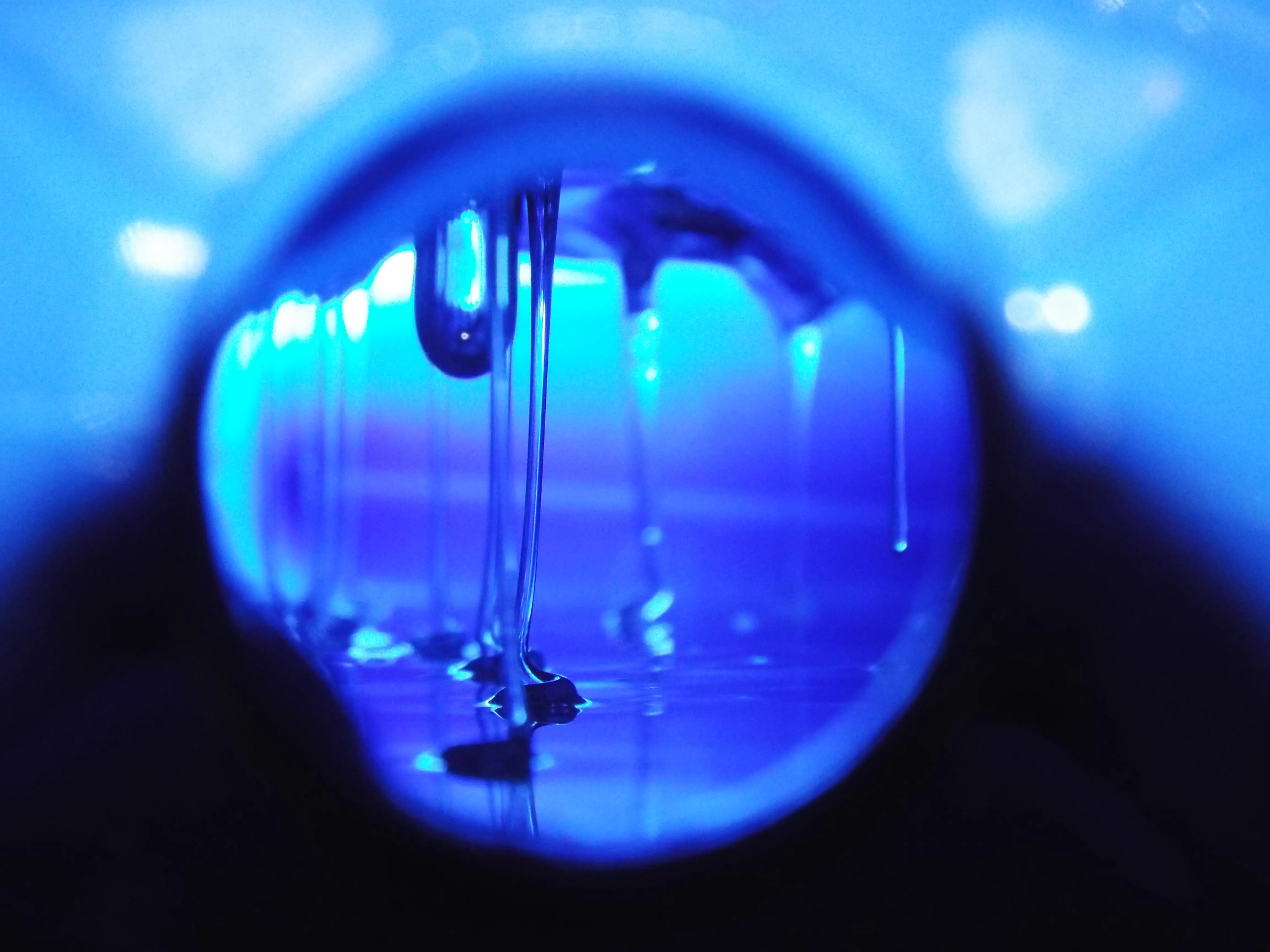 צילום מצלמת fujifilm 7200S, בתמונה פנים בקבוק שמפו עם שמפו בצבע כחול, בתצלום מאקרו עם מנורה בחלקו האחורי, אחרי שסובב מספר פעמים ליצירת הזקיפים, הנטיפים וכו'