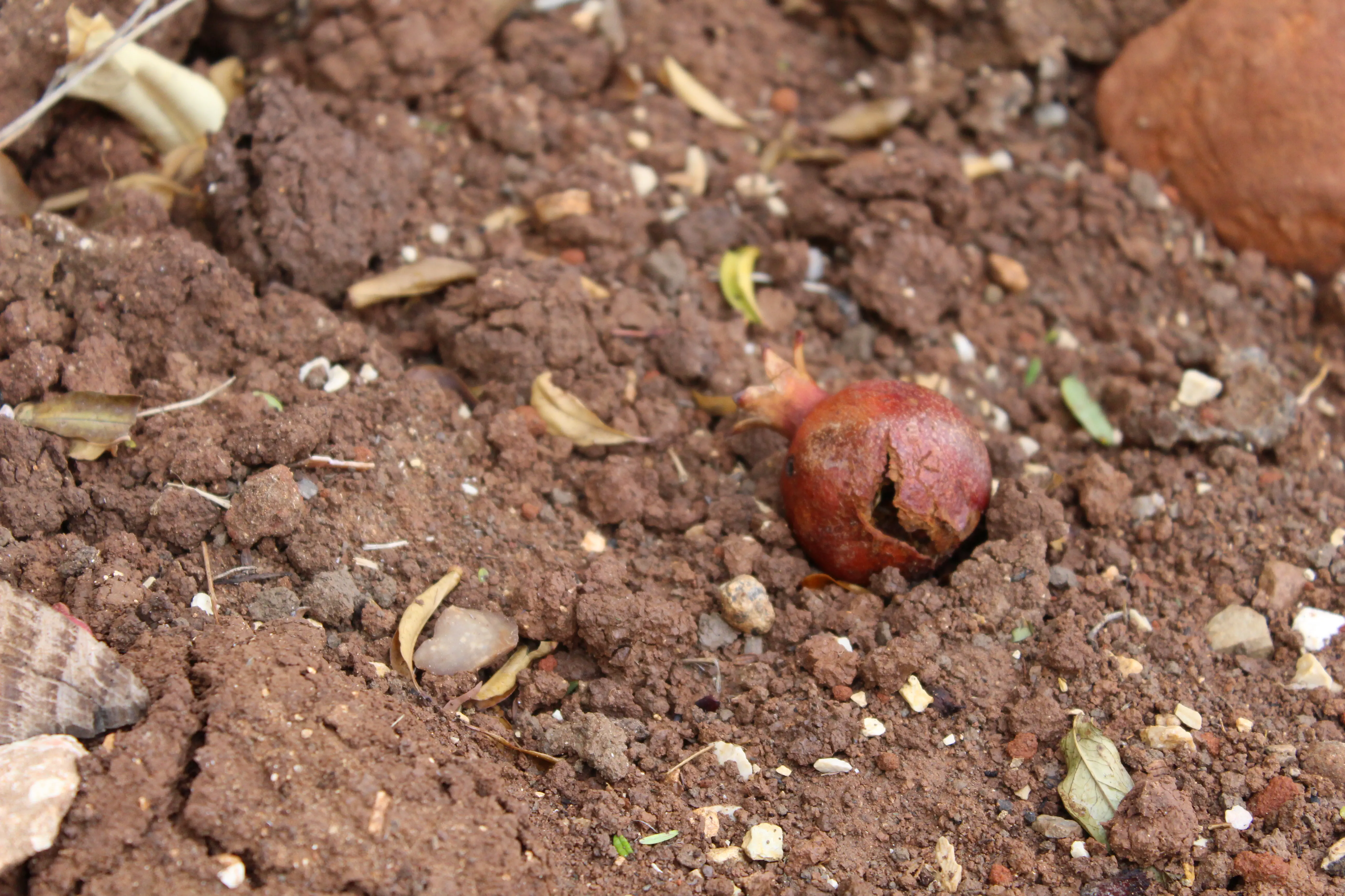 את התמונה הזו צילמתי בגינה שלנו. הצבעים של הרימון מדהימים בעיני ממש שילוב בין האדמומיות העזה שלו לחום האדמה אך אם מתבוננים היטב רואים שהצבע מטעה, משקר, והרימון פשוט רקוב.