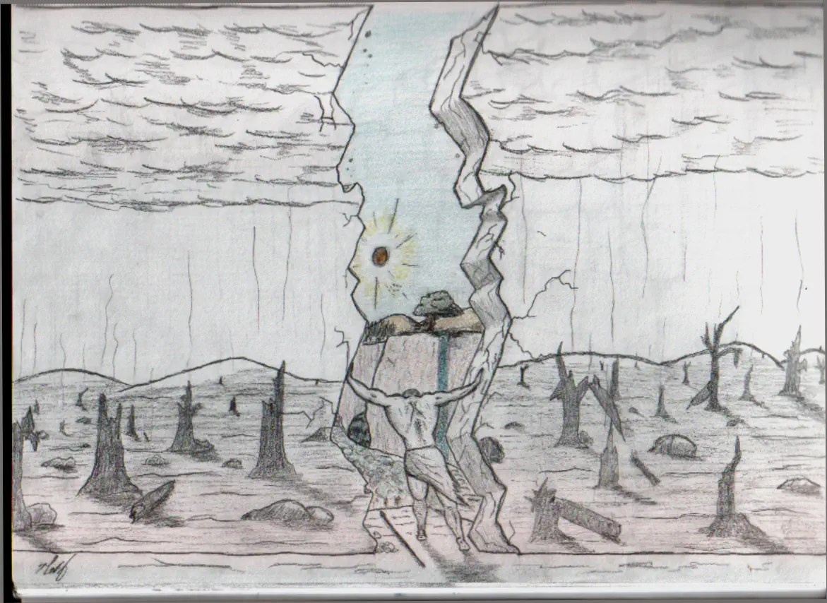 ובכן קראתי לציור "כי האדם עץ השדה". אם תשימו לב רואים בצידי הקיר השבור עצים חרוכים. זה בא לומר שאנשים הנמשלים לעצים הכזיבו, בגדו. הרבה שחיתות ורשע אנו קוראים ורואים כל יום. ולכן עצים אלו לא פורחים. אותו אדם ששובר את הקיר בעצם מואס במציאות זו ואחרי השבירה נגלה לעיניו מקום קסום עם נהר ועץ פורח (ממש באופק מי שלא רואה) משל לייחול למציאות אידאלית.